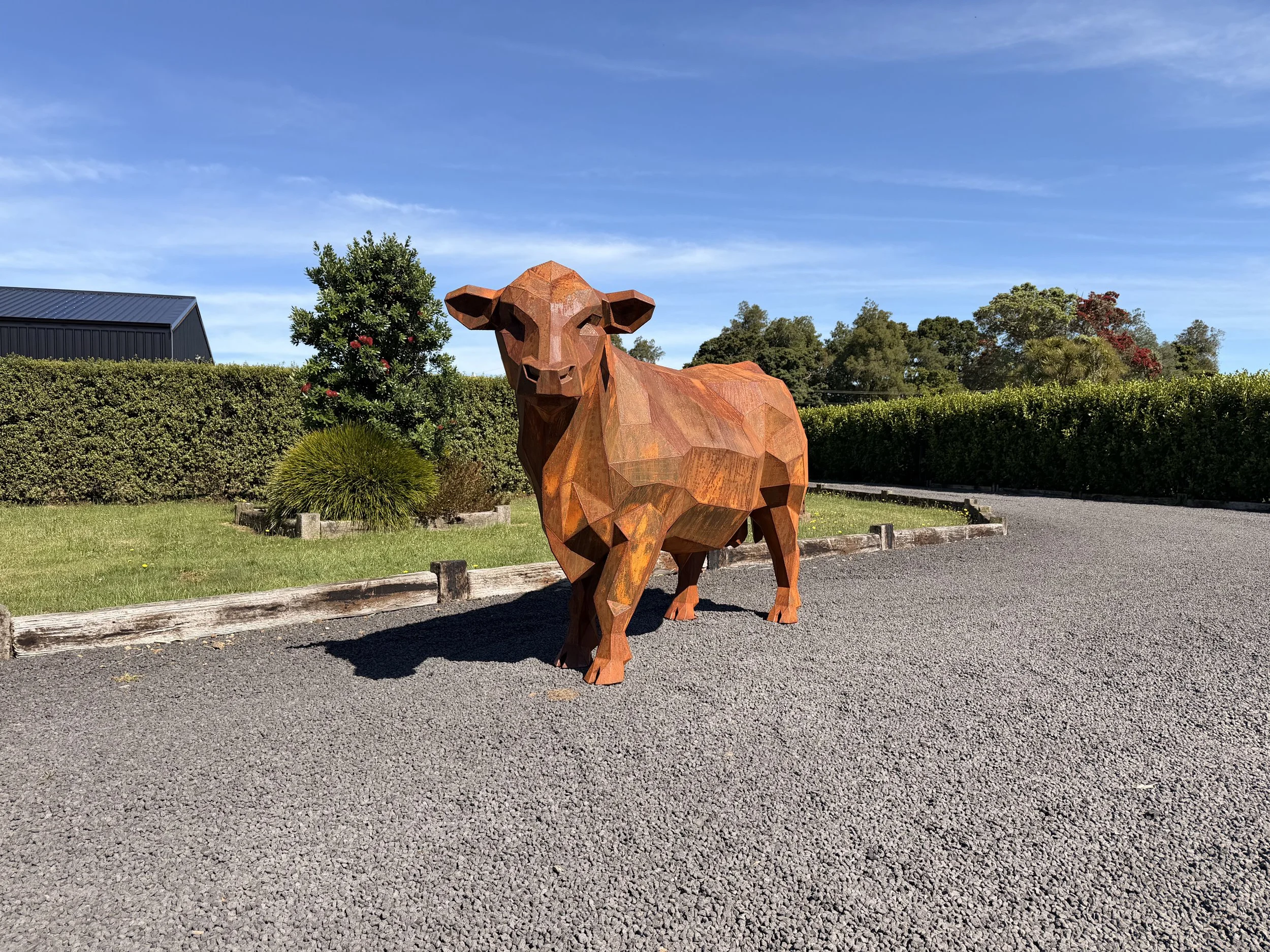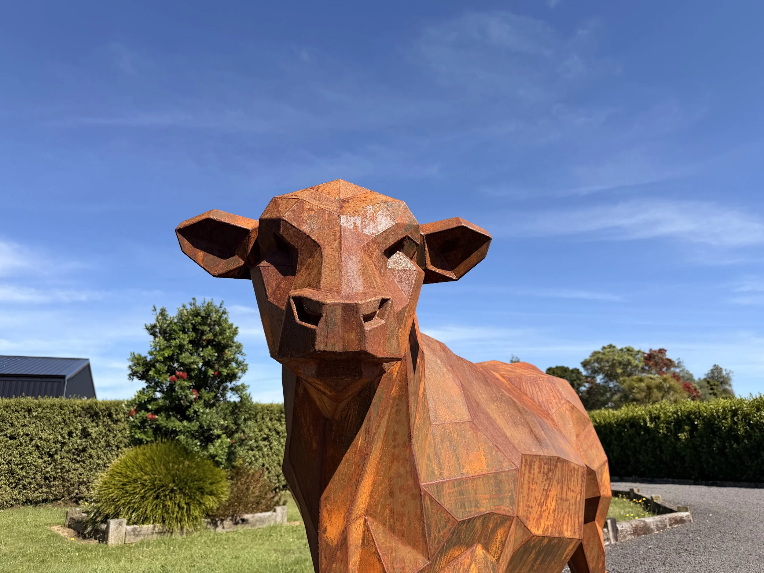 A large scale bull sculpture crafted from corten plate steel, designed to age naturally and develop a rich, rusty patina. Its strong geometric form gives it real presence while still feeling balanced and timeless in an outdoor setting. Built to live outdoors for decades, the piece suits farm entrances, landscapes, and rural commercial spaces. A professional painted finish is also available on request.