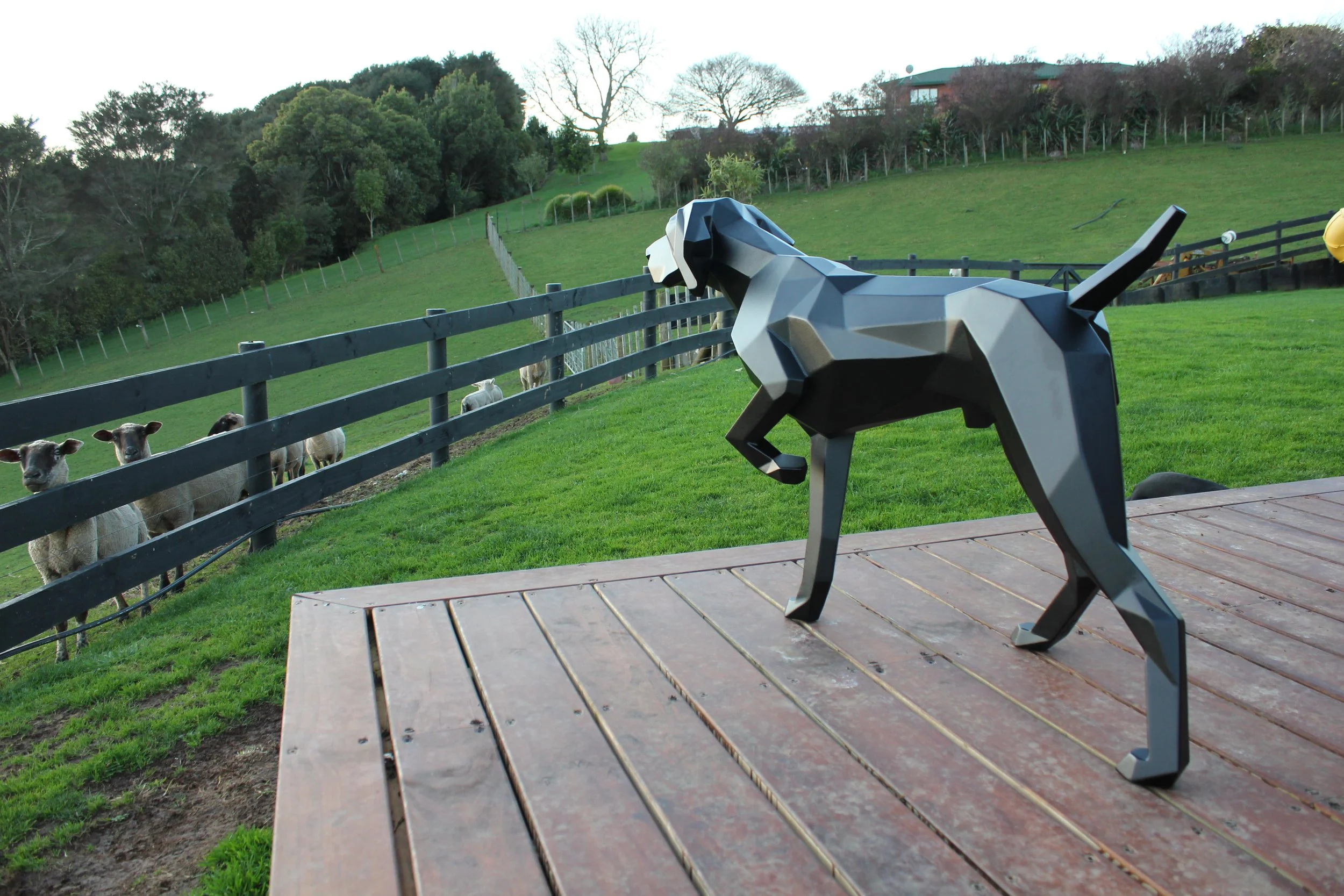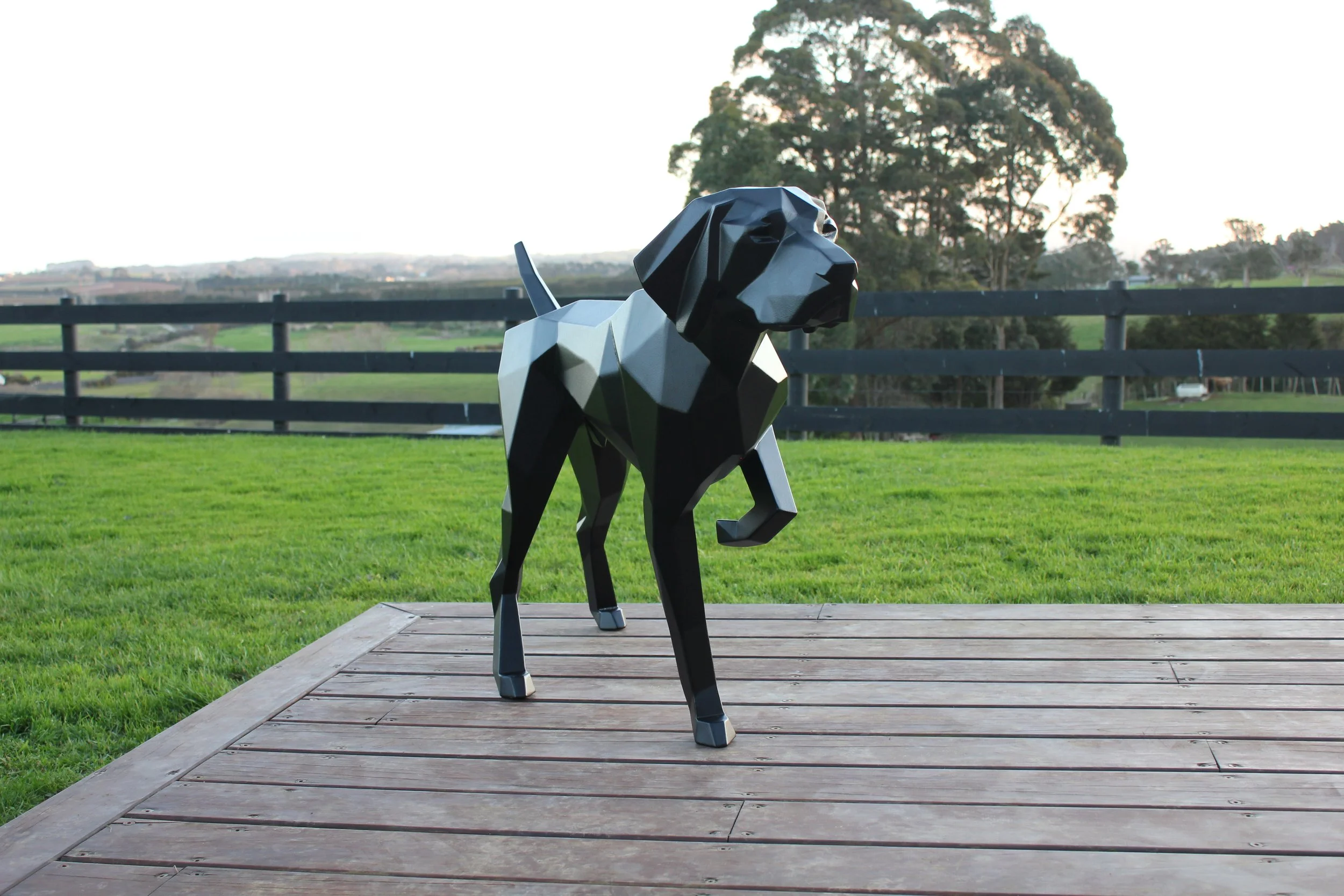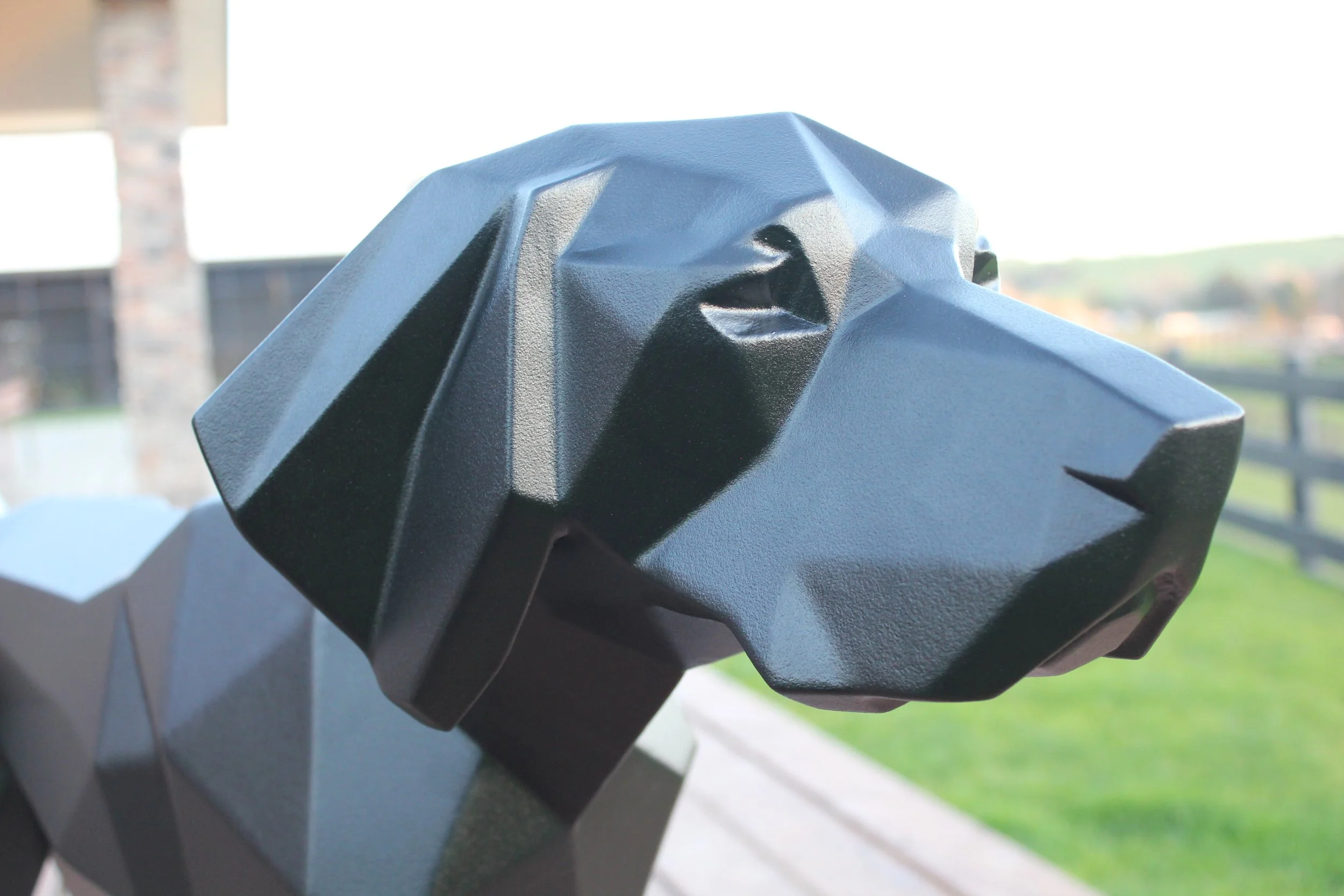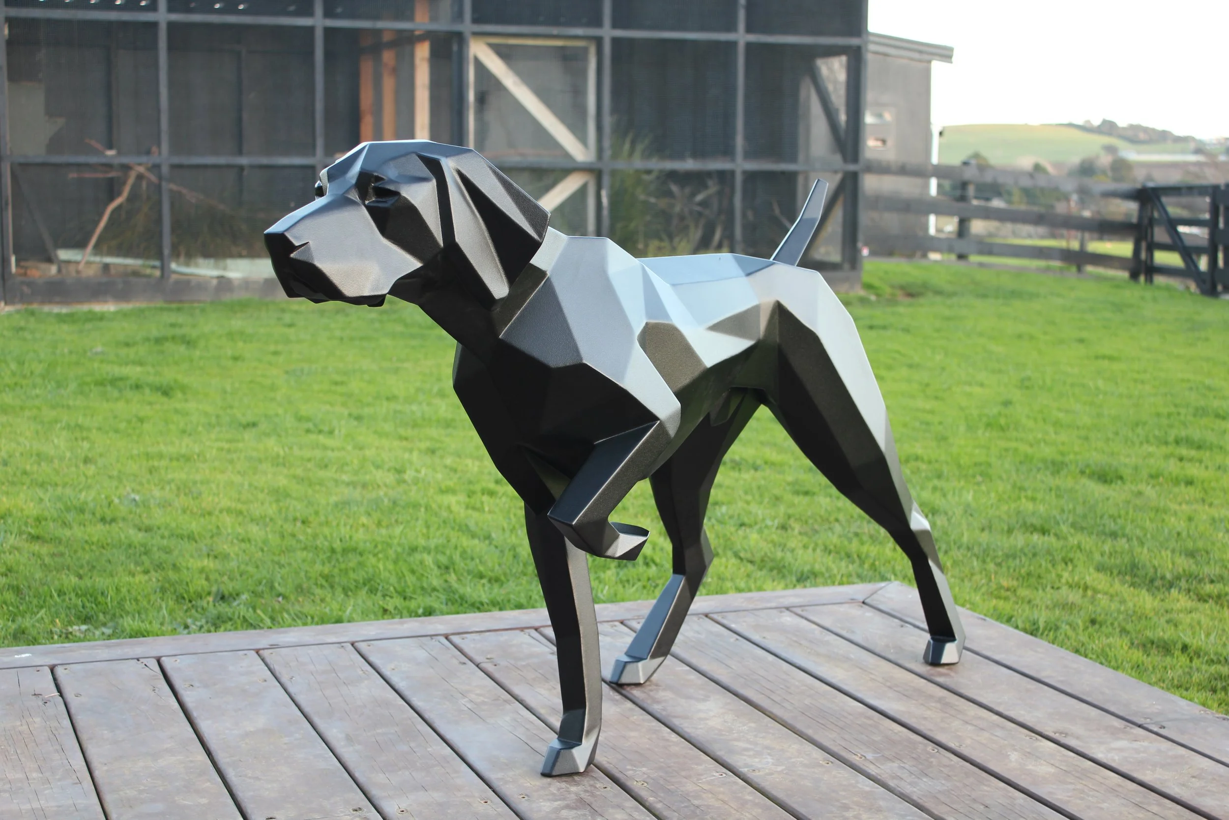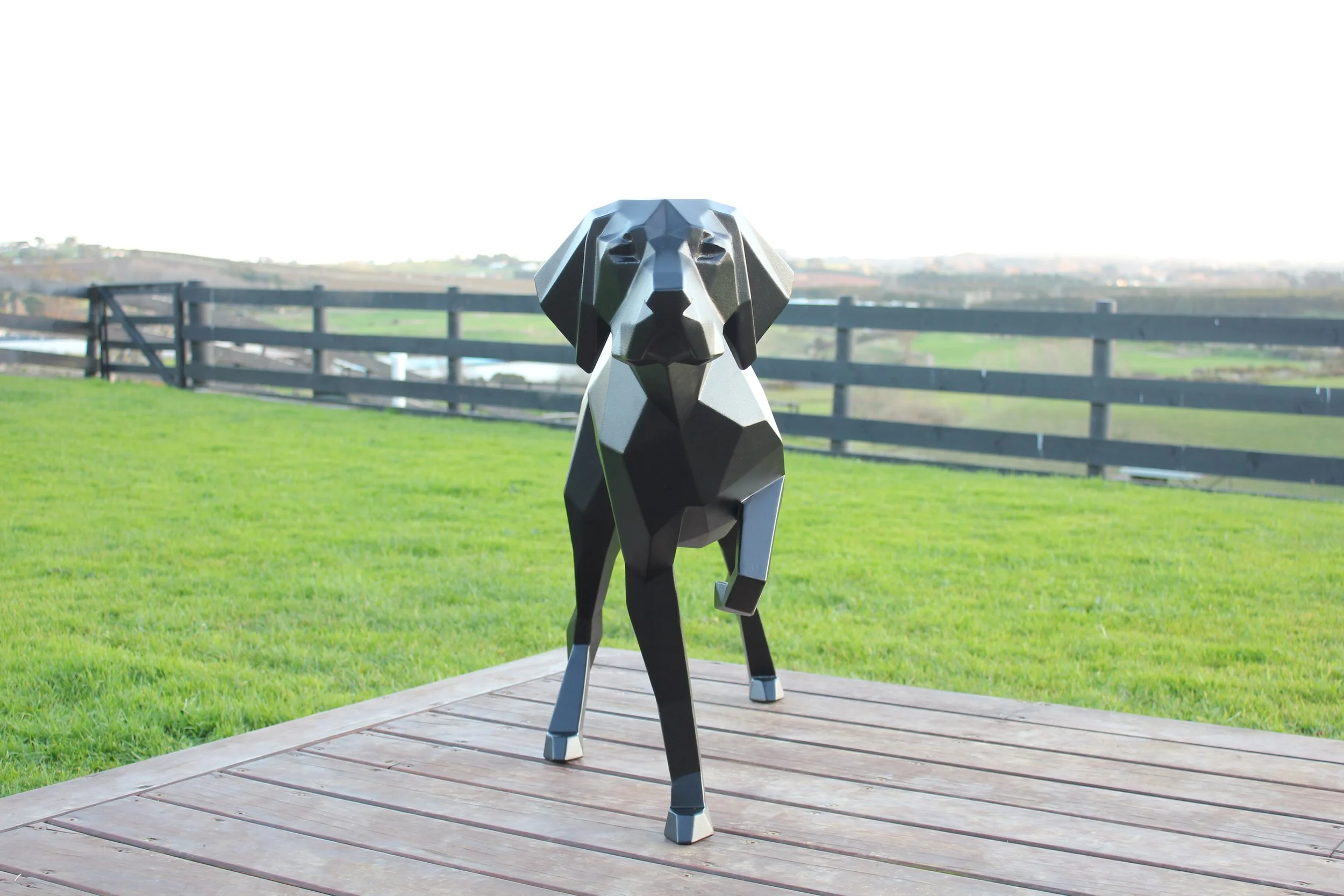 A geometric steel pointer dog, crafted from plate steel and finished in a durable commercial grade powder coat. Captured in a classic stance, the sculpture locks on point with strength and precision. The bold angular form highlights both the elegance and alertness of the hunting dog, making it a striking feature in any setting.